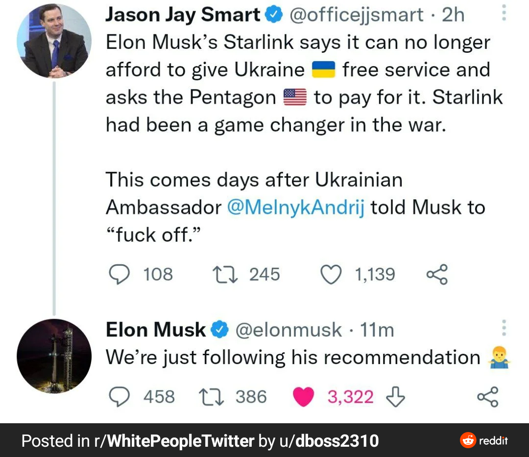 October 14, 20223 yr 44 minutes ago, Tweek said: What a dick Yep. Incredibly stupid and ungrateful thing that Ukrainian ambassador said. Good for Elon.
