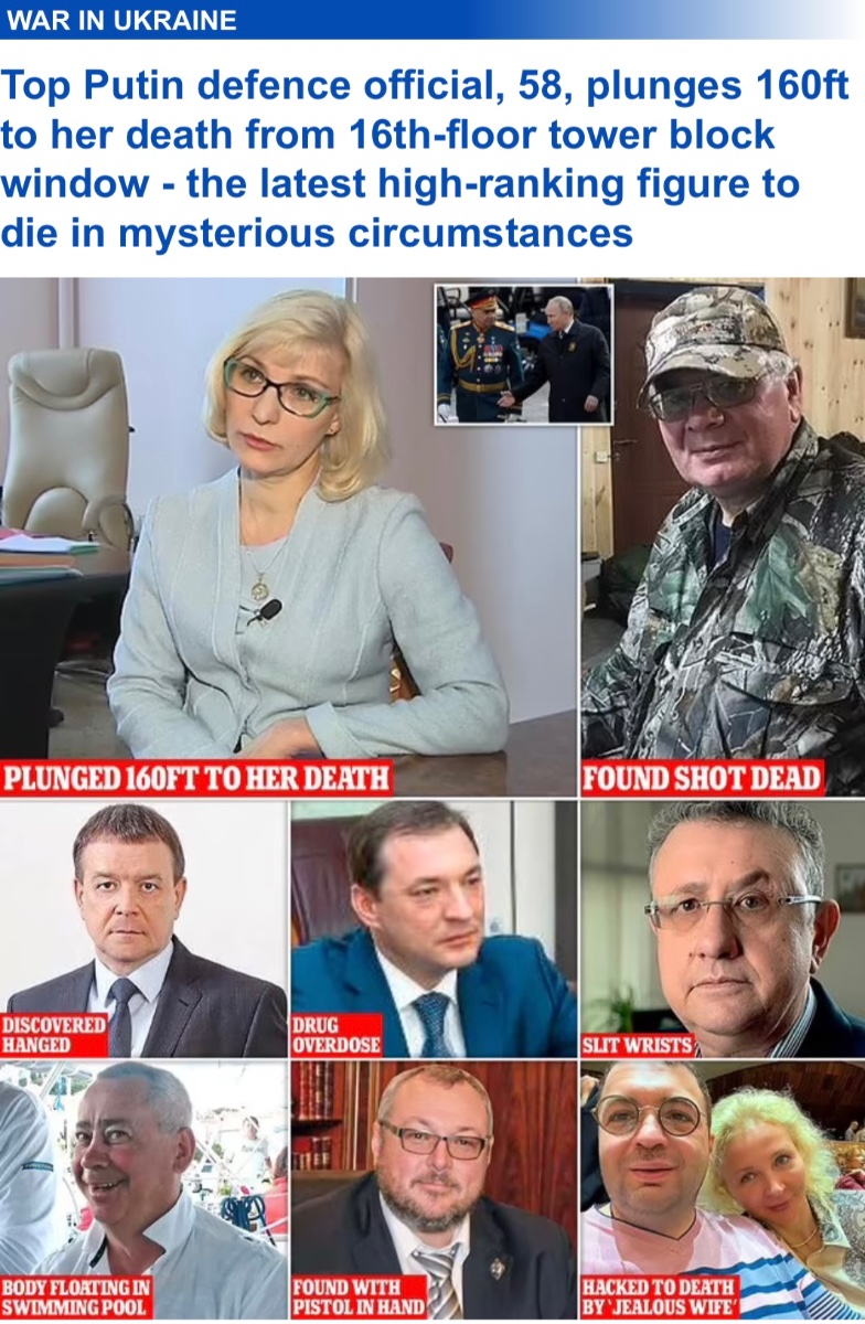 February 16, 20232 yr World’s deadliest occupation ? https://www.dailymail.co.uk/news/article-11758535/Top-Putin-defence-official-58-plunges-160ft-death-16th-floor-tower-block-window.html