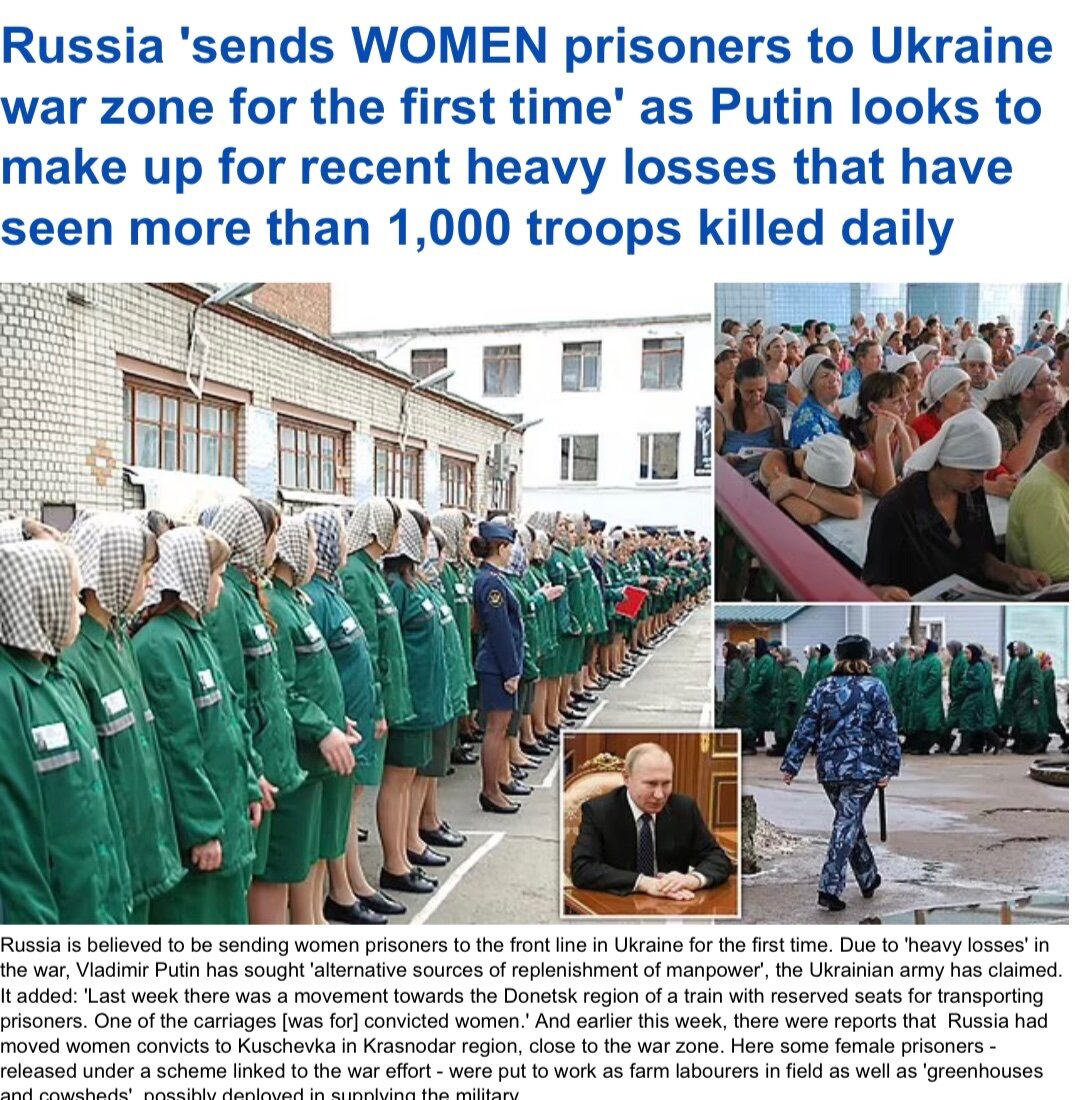 March 14, 20232 yr 1 hour ago, Talkingbirds said: https://www.dailymail.co.uk/news/article-11857317/Russia-sends-WOMEN-prisoners-Ukraine-war-zone-time.html Very disappointing picture to accompany a story like this