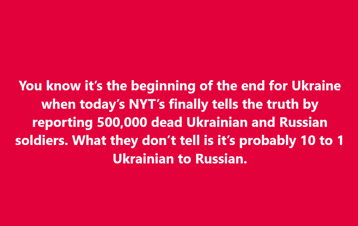 August 21, 20232 yr 18 hours ago, Lloyd said: The first 95% of that isn't news, right? You knew lots of people are dying there. And the remaining 5%...the "hot take"... includes the word "probably". So what part of this is new and newsworthy for you? Some guy thinks that "probably" Ukrainians are dying 10 to 1? But the bright red background!