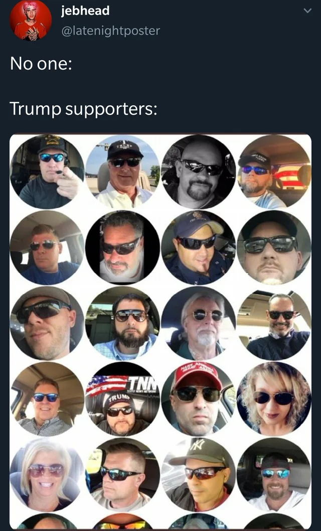 August 24, 20232 yr 1 hour ago, DEagle7 said: The "generic mildly overweight white dude with sunglasses a mustache and a crew cut" profile pic is a excellent detail. Wrap around shades and car selfies are MAGA mandatories.