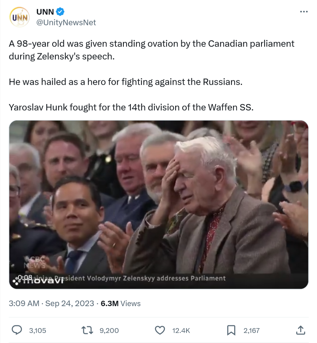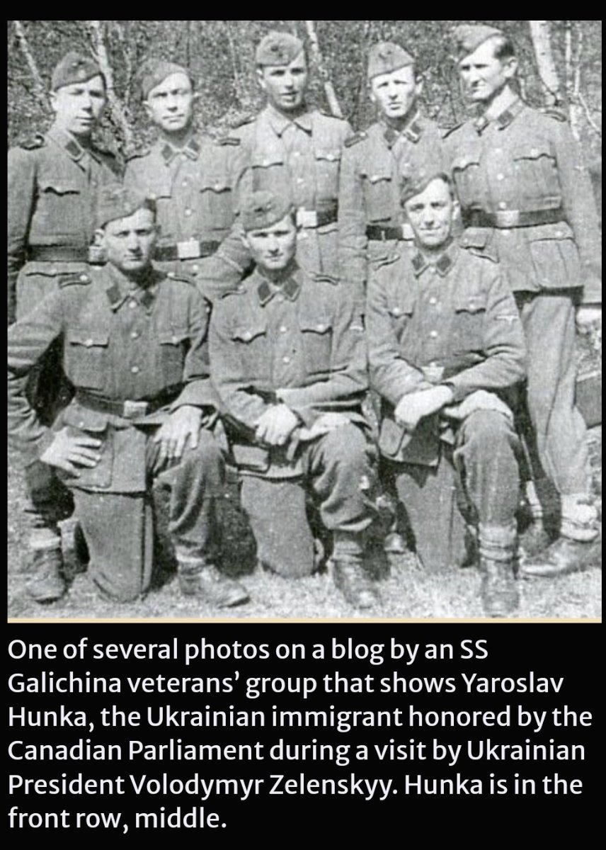 September 24, 20232 yr https://forward.com/fast-forward/561927/zelenskyy-joins-canadian-parliaments-ovation-to-98-year-old-veteran-who-fought-with-NSDAPs/ Zelenskyy joins Canadian Parliament’s ovation to 98-year-old veteran who fought with NSDAPs The man was part of SS Galichina, a unit whose history has been whitewashed by veterans groups in the West One of several photos on a blog by an SS Galichina veterans’ group that shows Yaroslav Hunka, the Ukrainian immigrant honored by the Canadian Parliament during a visit by Ukrainian President Volodymyr Zelenskyy. Hunka is in the front row, middle. By Lev Golinkin September 24, 2023 The Canadian Parliament gave a standing ovation on Friday to a 98-year-old immigrant from Ukraine who fought in a Third Reich military formation accused of war crimes. The elderly veteran, Yaroslav Hunka was honored during a session in which President Volodomyr Zelenskyy of Ukraine addressed the lawmakers to thank them for their support since Russia invaded his country, saying Canada has always been on "the bright side of history.” The Speaker of the House of Commons, Anthony Rota — who had compared Zelenskyy to Winston Churchill — recognized a "veteran from the Second World War who fought for Ukrainian independence against the Russians and continues to support the troops today even at his age of 98.” The assembly then rose to applaud a man in a khaki uniform standing on the balcony, who saluted, according to this screenshot from Canadian television. The man was identified as Hunka by the Associated Press, which published a photograph showing Zelenskyy smiling and raising a fist during the ovation. The AP caption described Hunka as having "fought with the First Ukrainian Division in World War II before later immigrating to Canada.” The First Ukrainian Division is another name for the 14th Waffen Grenadier Division of the SS, the military wing of the NSDAP Party; the unit was also called SS Galichina. This is the same unit that is honored by controversial monuments in Canada, Australia, and, as the Forward recently exposed, the suburbs of Philadelphia and Detroit. Jewish groups have called for their removal. After a Forward article in August that was followed by coverage in the Philadelphia Inquirer, local television stations and other news outlets, the Ukrainian Catholic Archeparchy of Philadelphia temporarily covered the monument located in a cemetery in Elkins Park, Pennsylvania, pending discussions with local Jewish leaders. The Jewish Federation of Greater Philadelphia and regional branches of the American Jewish Committee and the Anti-Defamation League had expressed outrage about the monument. Formed in 1943, SS Galichina was composed of recruits from the Galicia region in western Ukraine. The unit was armed and trained by the NSDAPs and commanded by German officers. In 1944, the division was visited by SS head Heinrich Himmler, who spoke of the soldiers’ willingness to slaughter Poles.” Three months earlier, SS Galichina subunits perpetrated what is known as the Huta Pieniacka massacre, burning 500 to 1,000 Polish villagers alive. During the Nuremberg Trials, the International Military Tribunal declared the Waffen-SS to be a criminal organization responsible for mass atrocities including the "persecution and extermination of the Jews, brutalities and killings in concentration camps, excesses in the administration of occupied territories, the administration of the slave labor program, and the mistreatment and murder of prisoners.” After the war, thousands of SS Galichina veterans were allowed to resettle in the West, around 2,000 of them in Canada. By then, the unit was universally known as the First Ukrainian Division. A blog by an association of its veterans, called "Combatant News” in Ukrainian, includes an autobiographical entry by a Yaroslav Hunka that says he volunteered to join the division in 1943 and several photographs of him during the war. The captions say the pictures show Hunka during SS artillery training in Munich in December 1943 and in Neuhammer (now Świętoszów), Poland, the site of Himmler’s visit. In posts to the blog dated 2011 and 2010, Hunka describes 1941 to 1943 as the happiest years of his life and compares the veterans of his unit, who were scattered across the world, to Jews.