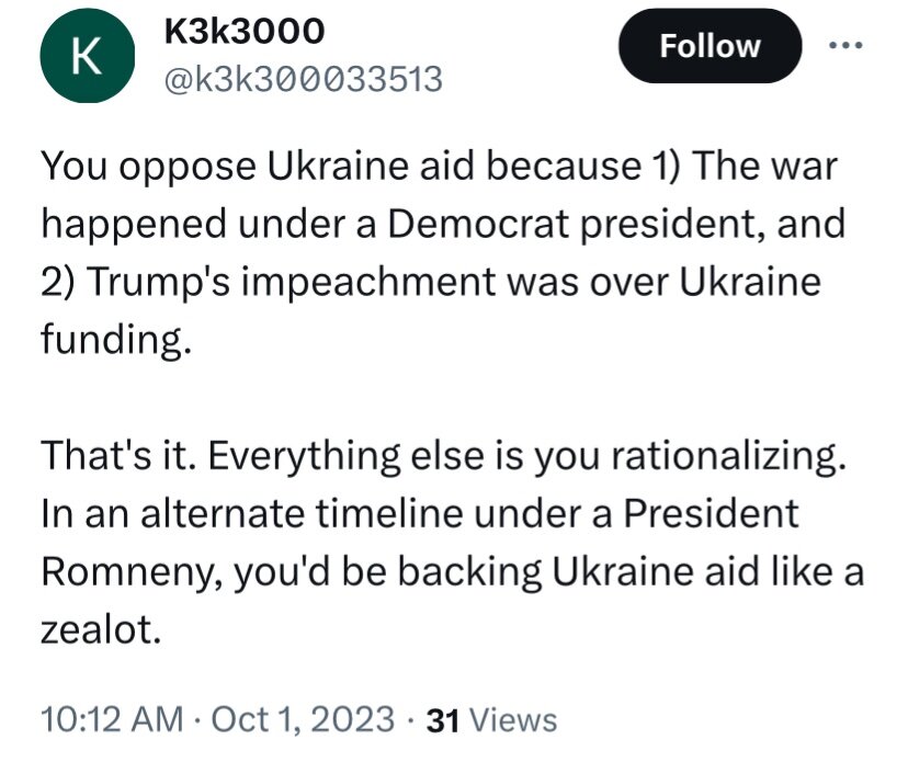 October 2, 20232 yr 52 minutes ago, Mike31mt said: Lol President Romneny....Im old enough to remember Obama laughing at Romney for considering Russia the biggest geopolitical threat You neocons can just send your entire paychecks to Ukraine, show us how devoted you are to the cause And I’m old enough to remember when Republicans weren’t appeaser bishes with a fascist dictator’s D in their mouth.