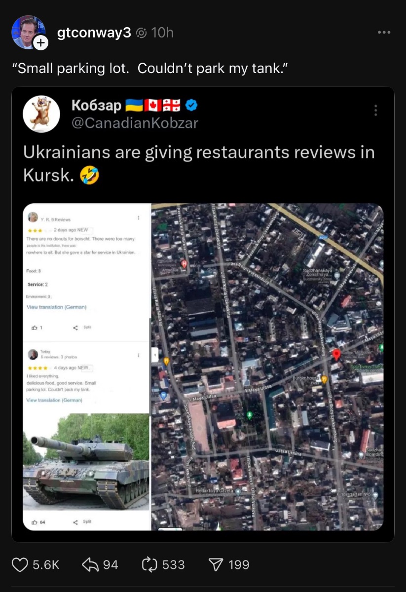 August 13, 20241 yr Ukraine's foray into Russian territory has been a much needed win in several ways and not the least of which is the optics and the positive momentum. Of course it will be awesome if they can continue to expand the area of control but even by just holding the current lines they win as they have rattled Putin/Russia and have also secured an important negotiation chip moving forward.