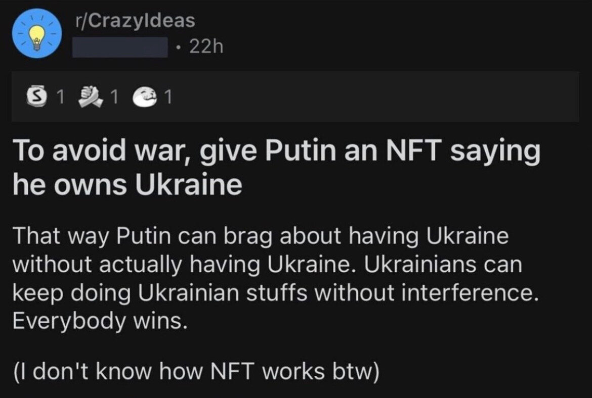 February 24, 20223 yr Just now, The_Omega said: Add something or go away. All you do is try to pick fights. Why would I go away when I can hear you tell us more about how Obama tricked Ukraine into giving up their nukes.