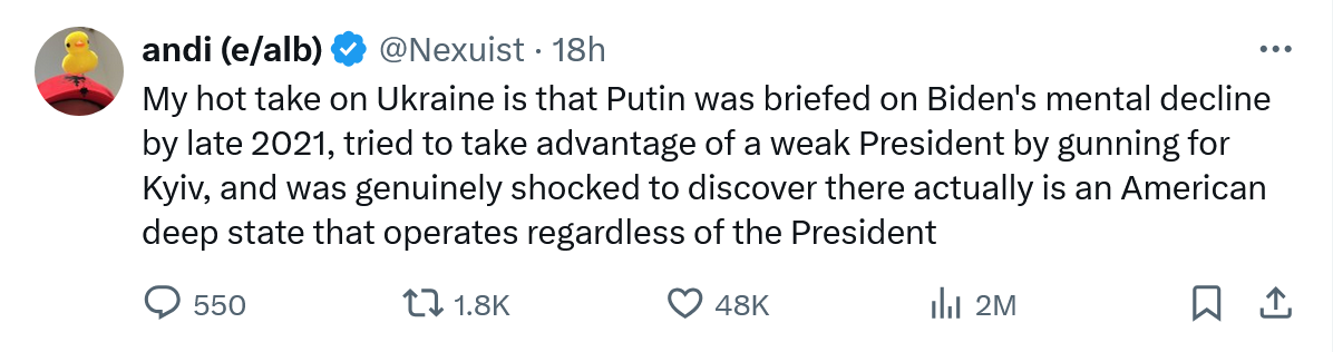 December 25, 20241 yr This, I mean you'd have to be absolutely retarded to think that Biden's dementia and diminished capacity didn't factor into Putin's decision to invade - especially after what happened in Afghanistan.