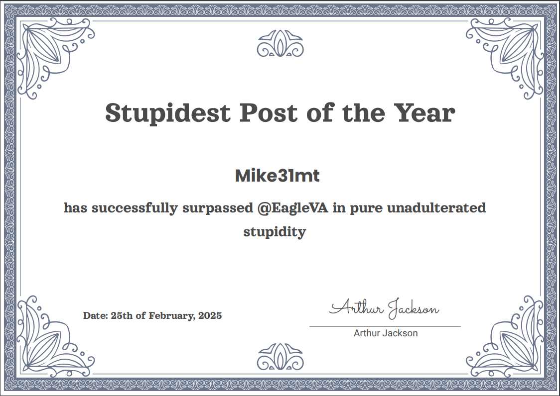 February 25, 2025Feb 25 Author 7 minutes ago, Mike31mt said: Trump will give Putin Ukraine for free! I know he didn't do that in the four years between Russia invading Ukraine during Obama and Bidens terms, but still, the TV told me. I'm smart, I play chess!