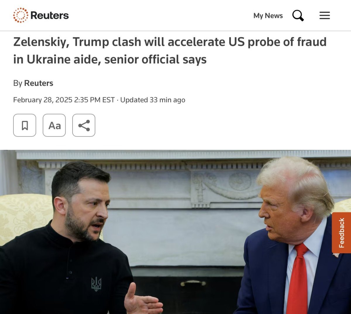February 28, 2025Feb 28 https://www.reuters.com/world/zelenskiy-trump-clash-will-accelerate-us-probe-fraud-ukraine-aide-senior-2025-02-28/