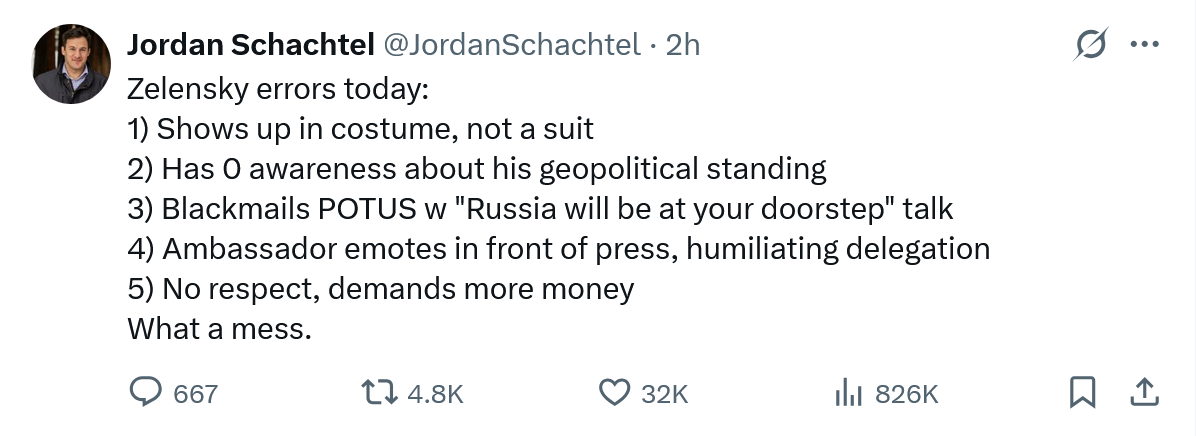 February 28, 2025Feb 28 6 minutes ago, DrPhilly said: Zelensky is desperate and he knows Putin. Trump's offer is a signed death warrant for the Ukraine. He had no other option but to try something. In the end, Putin is playing chess and Trump is playing checkers. Putin knows that Zelensky can't agree to Trump without a defense guarantee from the US. The entire deal proposal is a setup for in Putin's favor. The mineral rights are the defense guarantee. Our elites will protect their interests. Sure Zelensky is desperate, he doesn't want to admit he lost but he has. He had almost no shot to begin with but the final nail was driven into the coffin when Biden allowed Russia and China to get cozy.