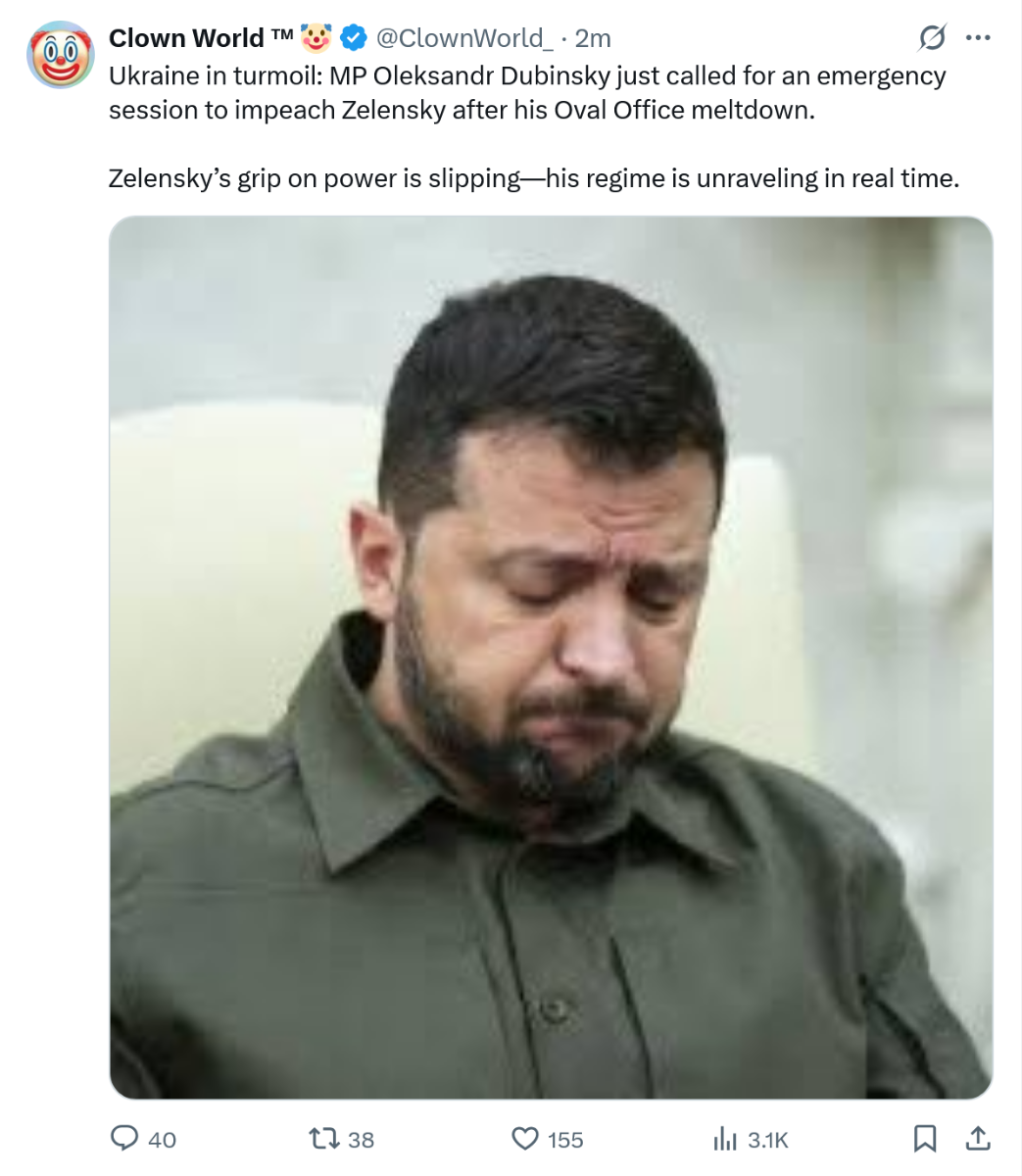 February 28, 2025Feb 28 13 minutes ago, The_Omega said: No deflection, just an observation. I don't need to deflect when others are claiming that losing ground and being drug along to a ceasefire agreement and being forced to sign is a victory. Actually, if Zelenskyy and you all are silly enough to be fine with this ending this way as long as you can, laughably, claim victory then celebrate to your hearts content. Not you, Trump
