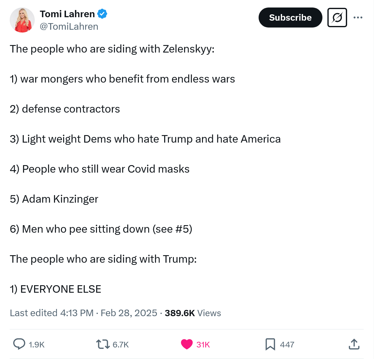 March 1, 2025Mar 1 10 minutes ago, DEagle7 said: Yup. Biden's biggest problem in Ukraine was not giving them enough weapons. Well intentioned, but not decisive enough. About 10,000 times better than blaming Ukraine and offering them nothing though like the quivering sack of crap in charge right now though. Which is really saying something Yeah. I saw the writing on the wall with domestic politics and thought we had an Overton window of aid. Another issue is that every time an aid package went through, the Biden team would be all "WE ARE GIVING UKRAINE BILLIONS OF DOLLARS of earmarked old equipment! WE HAVE SENT UKRAINE a small portion of the BILLIONS OF DOLLARS of earmarked old equipment!”