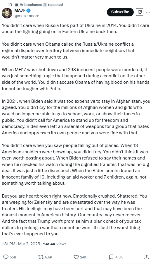March 3, 2025Mar 3 Just now, Kz! said: Pretty much sums it up. It's impossible to overstate just how much libtards' emotions are dictated by what the tv says to them. Always enjoyable to watch. Nobody cared about Crimea or MH17 shootdown? Lol WHAT? Come on, Kz. Your Facebook meme regurgitation used to be so much better. Have some self respect.