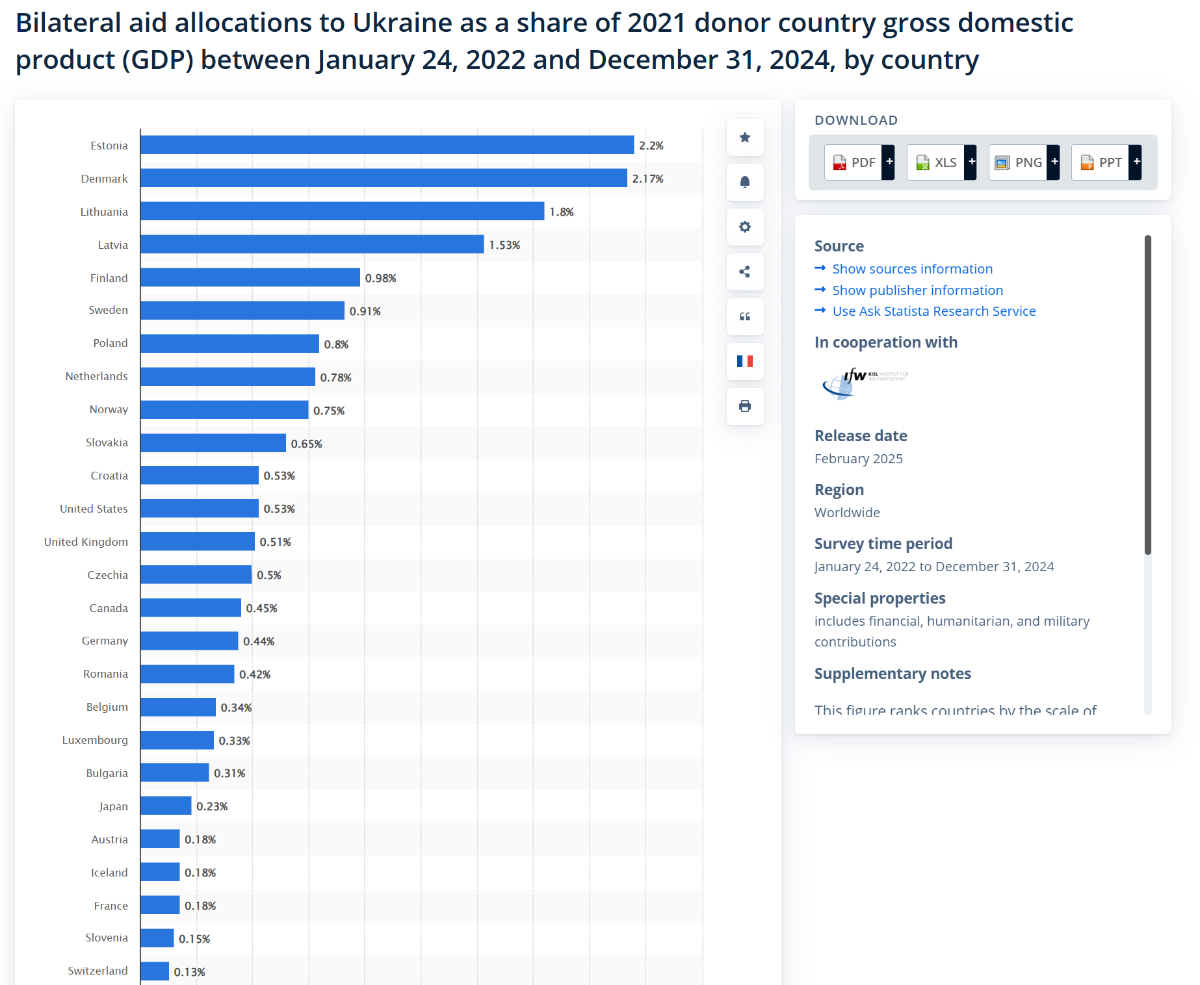 March 5, 2025Mar 5 40 minutes ago, Captain F said: Probably has nothing at all to do with them and their country footing more of the bill now. Nothing at all. https://www.statista.com/statistics/1303450/bilateral-aid-to-ukraine-in-a-percent-of-donor-gdp/ maybe you should sit down.