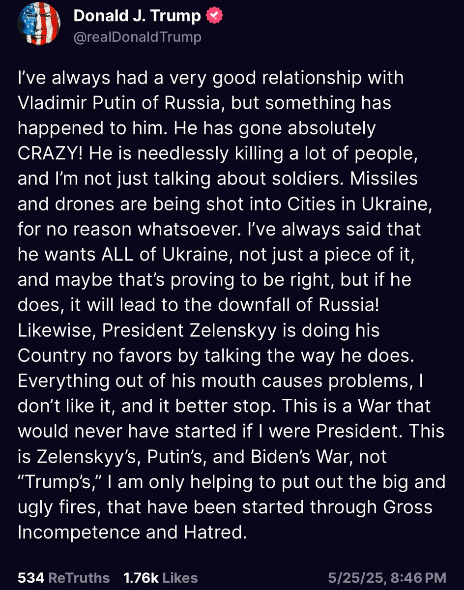 May 26, 2025May 26 3 hours ago, kiwieagle said:Putin has been playing Trump like a fiddle since Day 1Oh yeah? What about that "Vladimir STOP!” tweet? Huh? Checkmate.