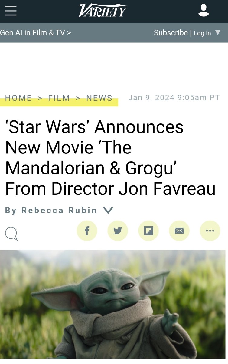 January 9, 20241 yr Author https://variety.com/2024/film/news/mandalorian-grogu-star-wars-movie-baby-yoda-jon-favreau-1235866277/ Quote It is unclear where the upcoming film will fit into the timeline of the live-action series, which has aired three seasons and is currently in development on the fourth.