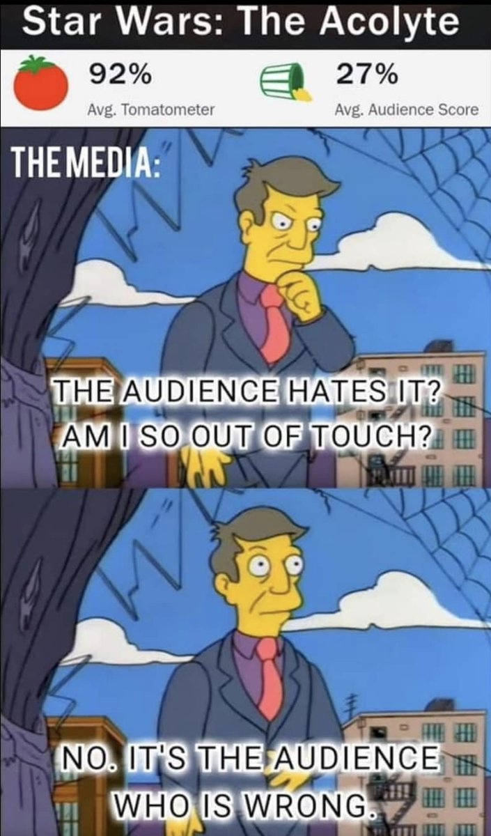 June 6, 20241 yr Media vs fans in one image.The series isn't trending well for paying customers and I just cannot think why that is?