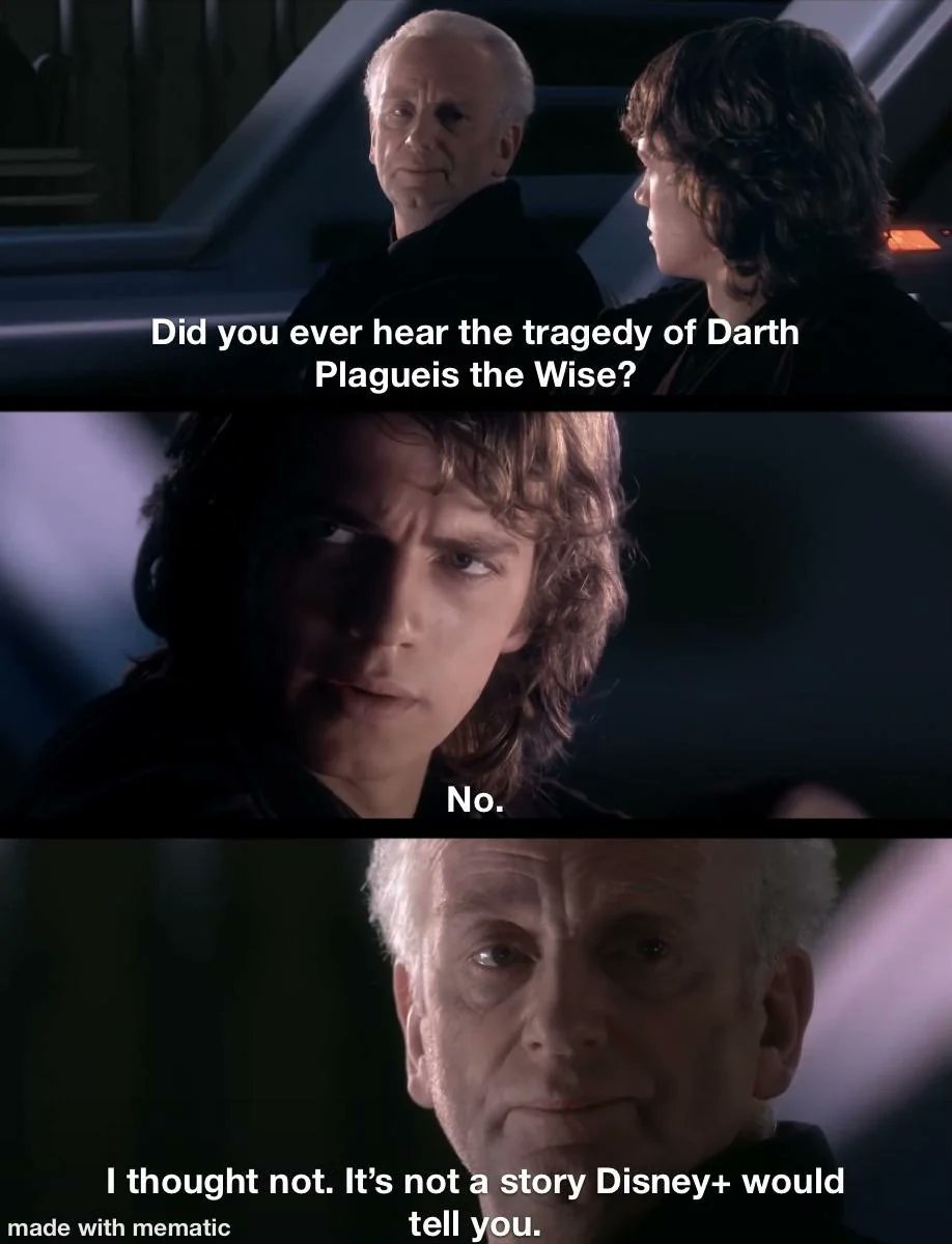 August 28, 20241 yr 47 minutes ago, Gannan said: They could easily do a Darth Plagueis series based on the Jame Luceno novel which is gloriously free of lesbian space witches. In a normally run production company, then yes. But this is Lucasfilm we are talking about. Known for how bad they are. I've still not forgiven them for beer gut Thrawn