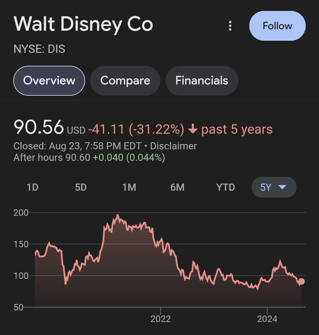 August 26, 20241 yr That is what Nelson Peltz was trying to get a seat on the board for. Because clearly the Disney execs are not maximising revenues with some of the slop they've put out on TV and Film, so are not doing the shareholders right. Even the theme parks are struggling - a new ride keeps breaking down and Galaxy's Edge Hotel had significant issues, plus they are expensive and complex to use with apps, etc. https://www.disneytouristblog.com/downtime-problems-tianas-bayou-adventure-magic-kingdom/ https://www.forbes.com/sites/suzannerowankelleher/2023/05/28/why-disney-closed-star-wars-hotel-galactic-starcruiser/ The company is prime to be taken by new mgmt and broken up, because its bloated and taking iconic IPs and making them a laughing stock