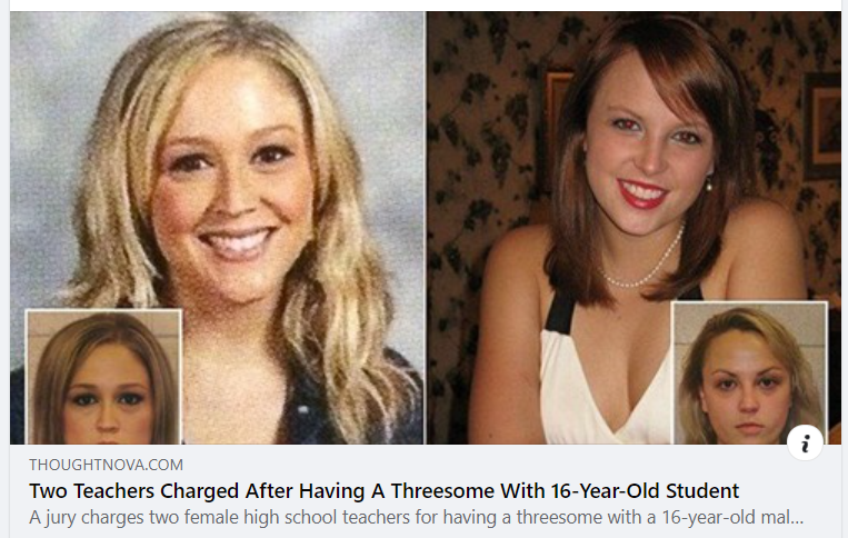 April 24, 20214 yr Author 5 hours ago, TCinPhilly said: Ladies and Gentlemen, we have a new champion. https://thoughtnova.com/two-teachers-charged-after-having-a-threesome-with-16-year-old-student/f8w3e2c?297=0 That 16yo is the champ of his HS right now. The guys are looking at him with awe and jealousy and the girls are looking at him with intrigue. Though his parents might not let him out of the house until he's 18. Still baffling how stupid these young female teachers are. They could have gone out to a bar in another town where they're not known and picked out a legal aged guy they both liked and propositioned him so they could sow their wild oats without earning a naughty rep where they live and most importantly losing their teaching licenses and going to jail. I really think the allure of, to use an analogy, taking a raw piece of clay and sculpting how you want it instead of one that's already been worked on by someone else is just too tempting for these women. There's the general idea how women like to try and change men to what they want them to be (and surprise, it doesn't work, and if it does then you just have a P-whipped wimp) so they must like that this way the job is much easier for them. It's practically pathological.
