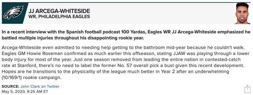 May 5, 20205 yr 13 hours ago, eglz1 said: JJAW was supposedly drafted to take Alson's role. Alshon won't be playing for likely the first half of the season, maybe longer. Here's his chance. Alshon’s timetable was early September. Now obviously it could be longer than that - Mills took longer, but it’s perfectly possible he’s ready in September.