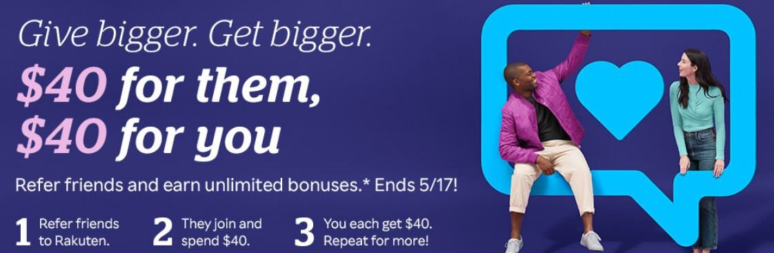 *Subject to the Referral Program Terms, Rakuten will pay you a $40 Referral Bonus through your Rakuten account for each Qualified Referral during the period beginning 12:01AM ET May 14, 2021 and ending 11:59PM ET May 17, 2021 (“Offer Period”). Notwithstanding anything to the contrary in the Referral Program Terms, this offer is valid only if the referral signs up and completes their qualifying purchase within 90 days. You and your referral must be located in the 50 United States or Canada to qualify. Offer may be modified or cancelled anytime.