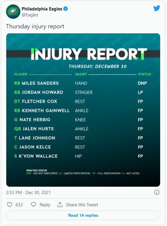 Posted December 31, 20213 yr Eagles Practice Report: Ex-Pro Bowl Rusher Trending Up By Mike Greger Updated Dec 30, 2021 at 6:27pm Getty: Eagles RB Jordan Howard is trending in the right direction as he rehabs from a neck stinger. The Philadelphia Eagles are going to need a heavy dose of Jordan Howard since Miles Sanders has been ruled out for Week 17. The one-time Pro Bowl running back has been nursing a neck stinger, but he was a limited participant at Thursday’s practice. That’s a real good sign considering kickoff is 72 hours away. He was listed "DNP” (did not participate) on Wednesday. Howard has been "working like crazy” to return, according to head coach Nick Sirianni, and the team’s training staff is doing their best to get him ready. The Eagles have veteran Boston Scott and rookie Kenny Gainwell behind Howard on the depth chart. They also inked Kerryon Johnson to the practice squad as an extra insurance policy. Sanders broke his hand during last week’s 34-10 win over the New York Giants, but there is no plan to place him on injured reserve. Sirianni compared Sanders’ injury to what Marlon Mack endured in 2019 with the Indianapolis Colts. He returned to the backfield three weeks after undergoing hand surgery in November and played the final three games. Mack finished with 1,091 yards on 247 carries that year. "I can share that with you, we’re not putting him on IR. So, obviously, we’re hoping that he’s back,” Sirianni said of Sanders. "He [Mack] broke his hand and was back a little bit later in the year. So, no timetable there.” Sanders was the only player listed "DNP” (did not participate) on Thursday’s practice report. Everyone else was a full-go, including quarterback Jalen Hurts (ankle), guard Nate Herbig (knee), and safety K’Von Wallace (hip). Reasons for Bringing Johnson Back Johnson began the year on the Eagles’ training camp roster but a freak knee injury forced his release. He didn’t make it onto the 53 and never found a new home on another team, save for a few special teams snaps in San Francisco. Now he’s back on Philly’s practice squad. Why? "We have confidence in him. That’s why we brought him back,” Sirianni said. "That’s always a good story for guys, for us to be able to tell next year, right, in training camp. Like not everybody might make this team, but there is a chance that you’re back, and this is an example of that. That’s something we said to Kerryon when he left, and look where we are now. He’s back and looking to help us win this game on Sunday.” That doesn’t mean he’ll be active. In fact, it seems unlikely they would call him up unless Howard suffers a setback. Jalen Hurts Chasing NFL History The argument for anointing Jalen Hurts the franchise quarterback has been getting more widely debated than Cheez Wiz or provolone these days in Philly. He’s a dynamic runner – something Lane Johnson attributed the mid-season turnaround to – and Hurts’ legs have a chance to make history. The NFL record for most rushing touchdowns by a quarterback in a single season stands at 14. Cam Newton did it in 2011. Hurts has 11 rushing touchdowns with two games left. There is a very good chance he breaks Newton’s mark. https://heavy.com/sports/philadelphia-eagles/jordan-howard-trending-up/