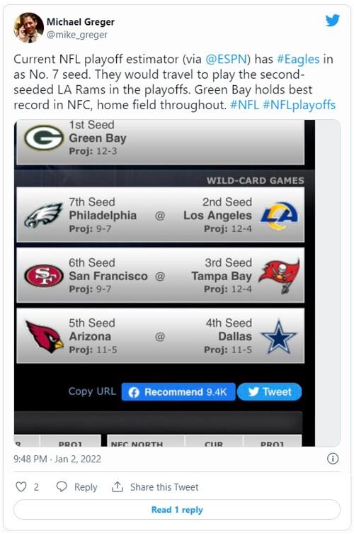 Posted January 3, 20223 yr Eagles Clinch Playoffs: Potential Opponents Revealed By Mike Greger Updated Jan 2, 2022 at 11:51pm Getty: Sean McVay talks to Matthew Stafford before the Titans game on Sunday, November 7. The Philadelphia Eagles have done what was unthinkable two months ago. They are officially in the NFL playoffs. Green Bay’s 37-10 victory over Minnesota on Sunday Night Football clinched them a trip to the postseason party. Or the dance, as Lane Johnson called it after the Eagles’ 20-16 win. San Francisco’s 23-7 win over Houston was the other domino they needed to fall. Once the Packers finished it off, there were no more shoes to drop. The Eagles (9-7) are currently the No. 7 seed in the NFC. Philadelphia would travel out to California to take on the Los Angeles Rams (12-4) in the wild-card round, if the season ended today. It doesn’t. Now the Eagles will have to decide whether they want to rest their starters in Week 18 or play them to try and move up the playoff ladder. While the 49ers (9-7) own the head-to-head tie-breaker over the Eagles, there is still a path to the No. 6 seed for Philly. San Francisco takes on Los Angeles in Week 18 in a game the Rams need to win to retain the No. 2 seed. Yes, things are getting interesting. Even more so considering the Eagles host the Dallas Cowboys on January 9. Yes, the hated stinkin’ Dallas Cowboys (11-5) are coming to town in the final regular-season game. And, guess what? The Cowboys need to keep pace with the Cardinals (11-5) to avoid falling out of the No. 4 seed to No. 5. The Cowboys blew their chance at the No. 2 seed by losing 25-22 to Arizona. Eagles Possible Playoff Opponents Los Angeles Rams (12-4): This is the most likely wild-card round opponent for the Eagles. They own tiebreakers over Dallas and Tampa Bay and split with Arizona. The Rams – all apologies to so-called "boy wonder” Sean McVay – would be the best possible matchup for Philly. Matt Stafford might be a one-time Pro Bowler but he’s clearly the most inconsistent of the five other signal-callers in the dance – remember, the Eagles cannot play San Francisco (Trey Lance/Jimmy Garoppolo) – and has played in only three playoff games. He’s thrown six interceptions over his last three games. Also, the Eagles had won six straight over the Rams prior to losing last season – a 37-19 defeat on September 20, 2020. Arizona Cardinals (11-5): The Eagles have surprisingly struggled against their one-time NFC East rivals over the years. Arizona holds a 60-56-5 all-time advantage over Philly. And the Cardinals beat the Eagles 33-26 in a wild shoot-out game last December. Kyler Murray threw for 406 yards; Jalen Hurts went for 338. The two have similar skillsets, so scout team practices would be fun. Murray is a matchup nightmare, one of the most dynamic quarterbacks in football – legs and arm, second to none – and was the MVP front-runner until spraining an ankle. He’s back and better than ever. Also, If the two teams faced off this year in the postseason there would one savory new wrinkle: Zach Ertz – the beloved Eagles Super Bowl champion – suits up for Arizona. Ditto for Jordan Hicks. Tampa Bay Buccaneers (12-4): Seeing Tom Brady in January is akin to welcoming the Grim Reaper into your house. Don’t do it. Don’t ask for it. In February? Against the NFC East? Well, we like our odds there. Seriously, though, Tampa Bay has been a tricky team to figure out through 16 games. The Bucs have been decimated by injuries, especially at the skill positions: Leonard Fournette, Chris Godwin, Scotty Miller, Giovani Bernard, and Antonio Brown’s craziness. The defensive side has been hit hard, too, especially in the secondary. Could be a dream scenario for a physical team (hint, hint) that loves to win in the trenches (hint, hint), right? Maybe. The Eagles only lost by six points, 28-22, when the two teams met on October 14. But, once again, do you really want to see Brady? I don’t. Dallas Cowboys (11-5): This would be the perfect ending to a Cinderella season that came out of nowhere. Beat the Cowboys in the final game to move up the playoff ladder for the chance to see them again in the wild-card round. You can’t script it much better than that, plus the Cowboys looked vulnerable during Sunday’s 25-22 loss to Arizona. The Cardinals held the NFL’s second-best offense – Tampa Bay is No. 1, 405.8 yards per game – to 301 total yards, with a good chunk of that Cowboy yardage coming in the fourth quarter. Problem is, when Dallas is humming on offense they are unstoppable. Dak Prescott is as efficient and deadly as any quarterback in the NFL. He has thrown for 4,154 yards and 32 touchdowns (10 interceptions) despite missing a game. He is surrounded by talent, too. Ezekiel Elliott, Tony Pollard in the backfield, along with Amari Cooper, Michael Gallup, CeeDee Lamb at receiver. They are a dangerous team. And NFC East champions for a reason.