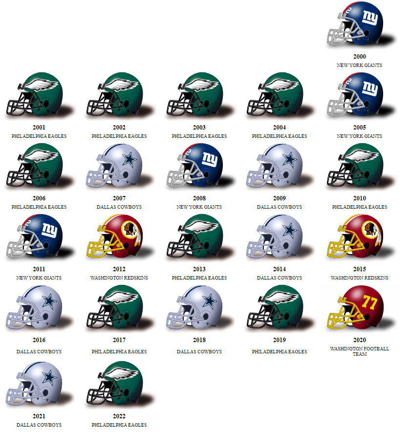 June 19, 20232 yr Here's the NFC East record for the 21st Century (this includes a few years of the Cardinals, of course): Spoiler Here's the list of Division Champions for that span of time: Spoiler