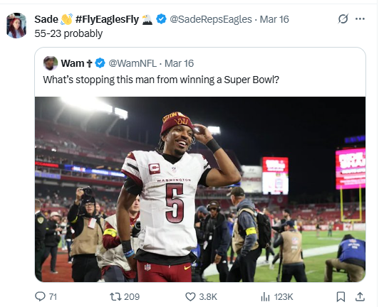 February 26Feb 26 FWIW on DC in 2024: That was a wonderful one-off season full of one year rentals and a Hail Mary. I love their QB but they still have some serious roster building work ahead of them. Bringing back every old guy is not going to get them what they want. Good for them and their long suffering fans but the real work starts now.