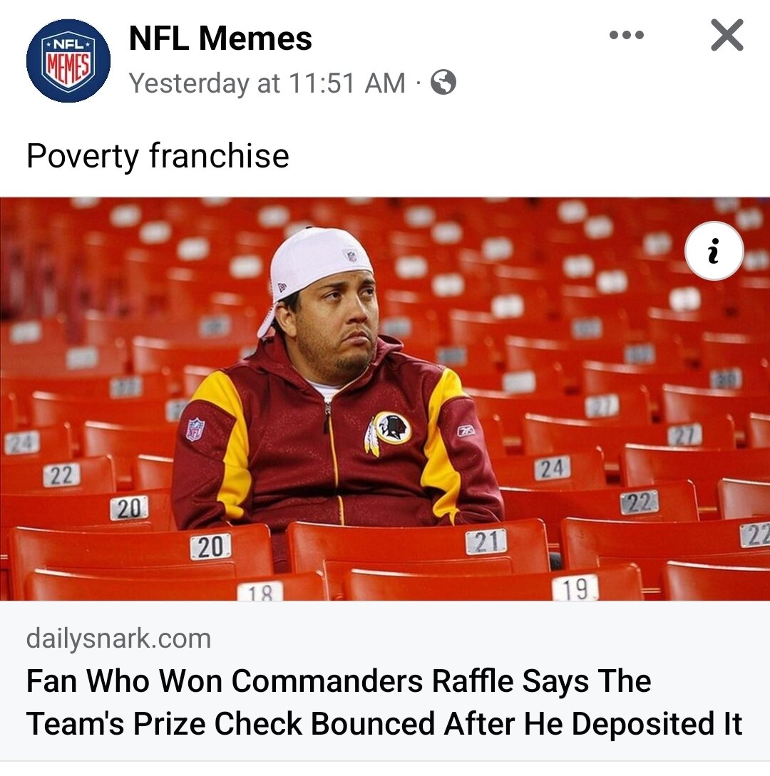 October 19, 20222 yr Did you hear that the Commanders sent a bounced 14k check to a raffle winner. That franchise has to be the worst in the NFC.