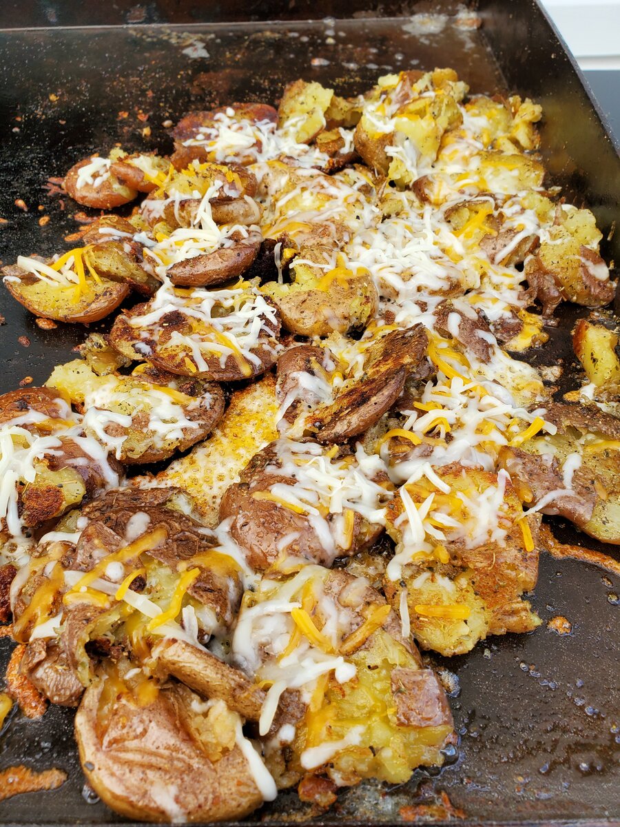 August 18, 20223 yr 7 minutes ago, BFit said: Those look banging. What's the procedure here? Thanks, they were great. Wife & son loved them. I used petite potatoes tri-color from Costco. Rinsed in water, microwaved in a bowl for 6 minutes to steam & soften up. Then coated in olive oil. On the griddle, put butter down first. Dumped the potatoes then used my burger press that I use for smash burgers (which are delicious btw). I pressed the potatoes to smash them. Then seasoned with salt, garlic powder, black pepper & oregano. Cooked about 5 minutes, flipped. Drizzled with olive oil & seasoning. About 5 more minutes. Sprinkled with shredded cheese.