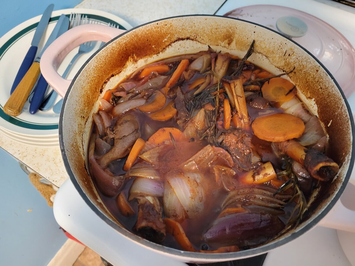 March 21, 20223 yr I'm always bad getting pics when the stuff finally gets on the table. It's always kinda hectic. Hard to see the shank in there under the vegetables. I might get a better shot when I make warm-ups later this week. It's pretty simple prep, but the wine and balsamic vinegar give it a ton a flavor, and after 3 hours in the oven, the meat just collapses off the bone and truly has synergy with a glass of rioja. I serve it on a bed of creamy mashed potatoes and lashings of the braising liquid after reducing it a bit.   Â