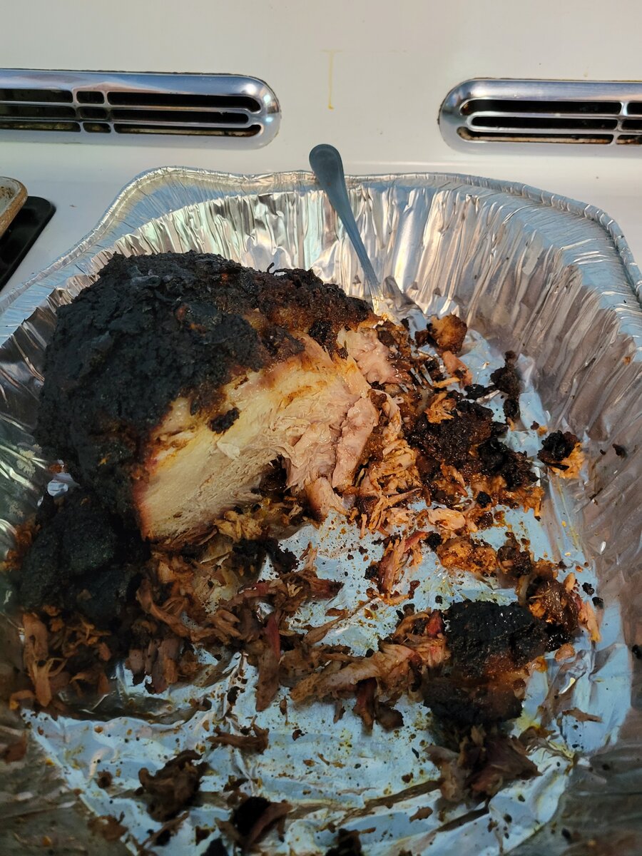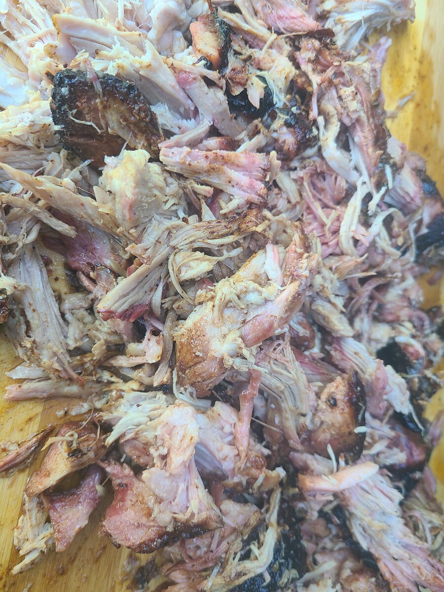 May 30, 20223 yr So, this is the third time I've done this. It was great, very tasty, but I think the second time was the best so far. One thing I've learned is that that 203-205° range really is the sweet spot to get the meat to pull like you would expect in a perfect world. I also wonder a little bit if the cut I got last time was just better. It was falling off the bone this time, but not quite separating in little strands as you'd like. Oh well, live and learn. Next time, the plan is to get my house totally cleaned up with a day to spare, get that b***ch smoking by 7 AM to leave a good 10-hour cushion, and then if I pull it off and it has to wait a good hour or two before guests arrive til I can cut it up, that's all the better. Didn't have the time or presence of mind to get pics of slicing it up when everyone was in need of feed, but here's the remnants of the first serving. If you like wine, these are great with malbec, zinfandel, and/or petite syrah. As it stands, breakfast was great this morning! @BFit, so I got about 1/3 of the pork butt in saran wrap and am thinking about freezing it as a solid hunk and then having a couple friends over for a low-key gathering next month. Any special advice on how to store and re-heat it in that manner? Appreciate all your help in these adventures! 🍻