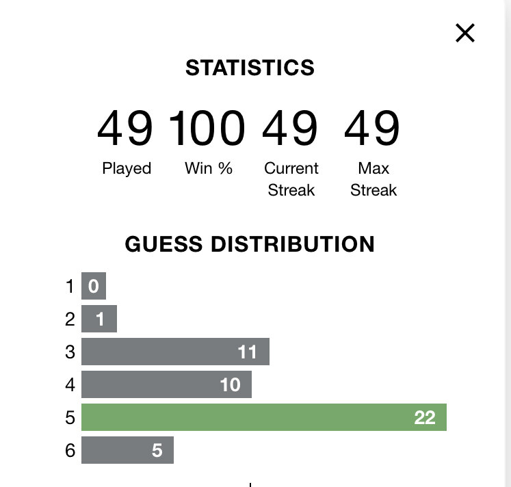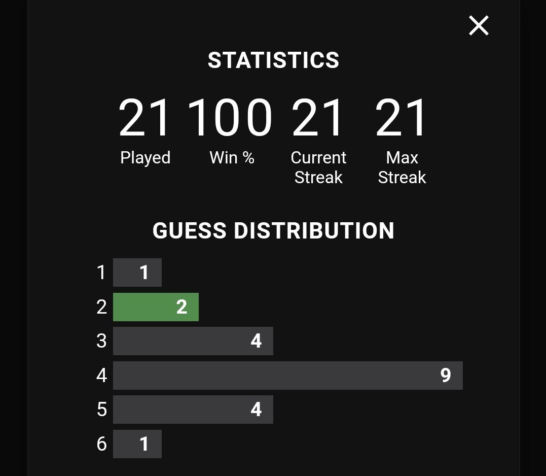 March 5, 20223 yr 5 hours ago, iladelphxx said: So how do I have a streak of 39 if I played 40 and I'm at 100%? Wordle 259 3/6 🟨⬛⬛🟨⬛ ⬛🟨🟨⬛⬛ 🟩🟩🟩🟩🟩 Did you miss a day? I would think if you just don't play a day you'd still keep 100% because you didn't lose but your streak would be broken.