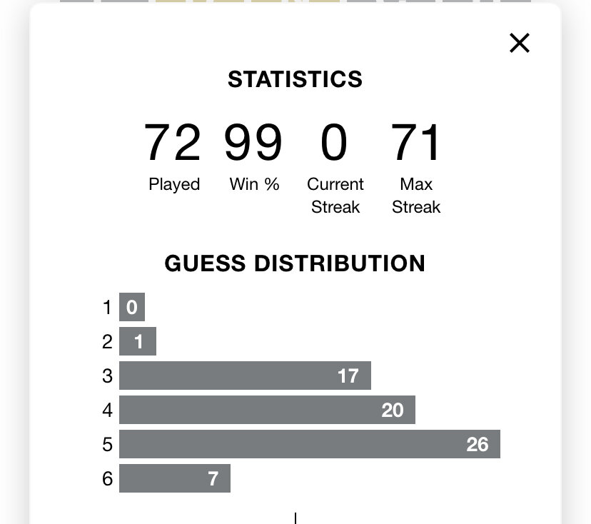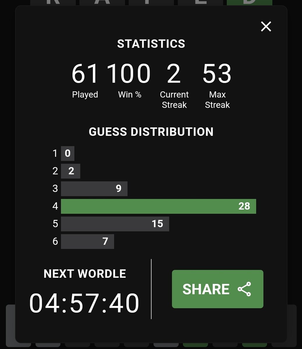 March 30, 20223 yr Wordle 284 5/6 🟨⬜⬜🟨⬜ 🟩🟩🟩⬜🟩 🟩🟩🟩⬜🟩 🟩🟩🟩⬜🟩 🟩🟩🟩🟩🟩 I hate being one off and taking 4 tries