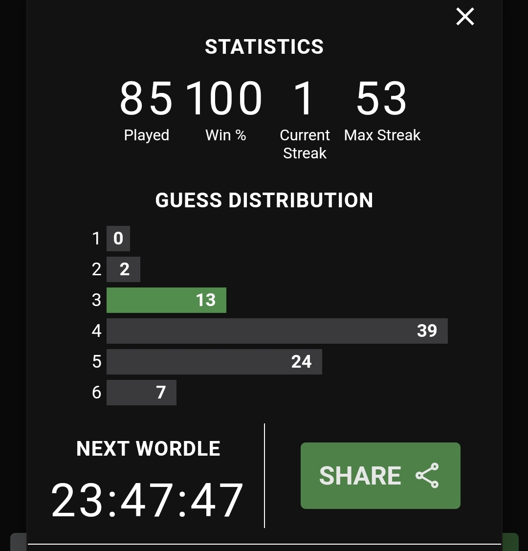 April 22, 20223 yr 31 minutes ago, iladelphxx said: Yes.ย Ok. Because you posted your Wordle 305 score here on Wednesday. The screenshot you posted is after midnight on Friday, Wordle 307. Your streak ends if you missed Wordle 306 on Thursday, but it doesn't count as aย loss so you are still at 100%. I don't know what's going on if you solvedย Wordle 306 on Thursday too.
