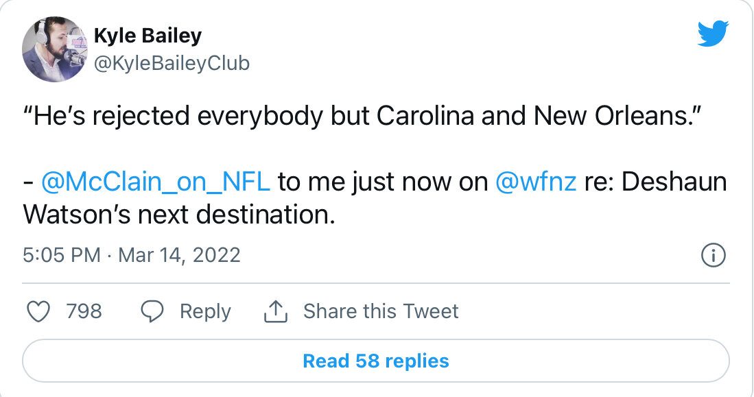 March 15, 20223 yr One of these reporters are lying. Watson only lifting his trade clause for Carolina and New Orleans made ZERO sense from the jump. Eagles are still very much in play
