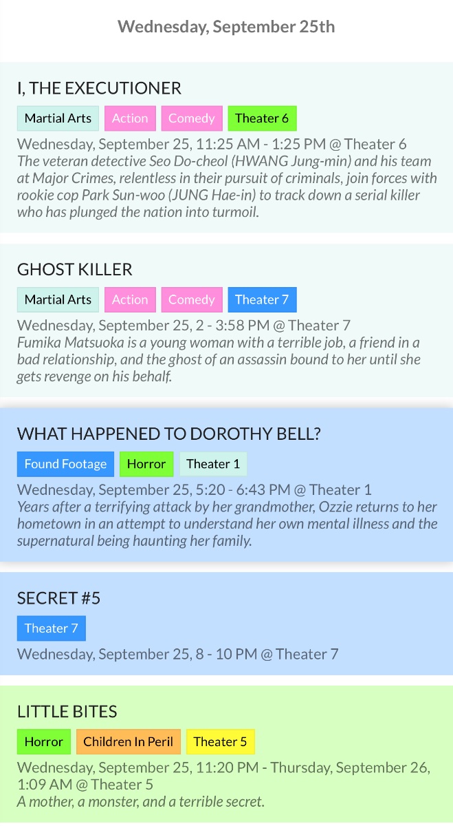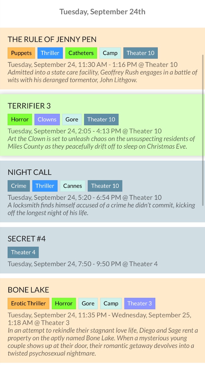 September 25, 20241 yr Today and tomorrow’s schedule. Trying to get todays last movie swapped out for V/H/S Beyond.