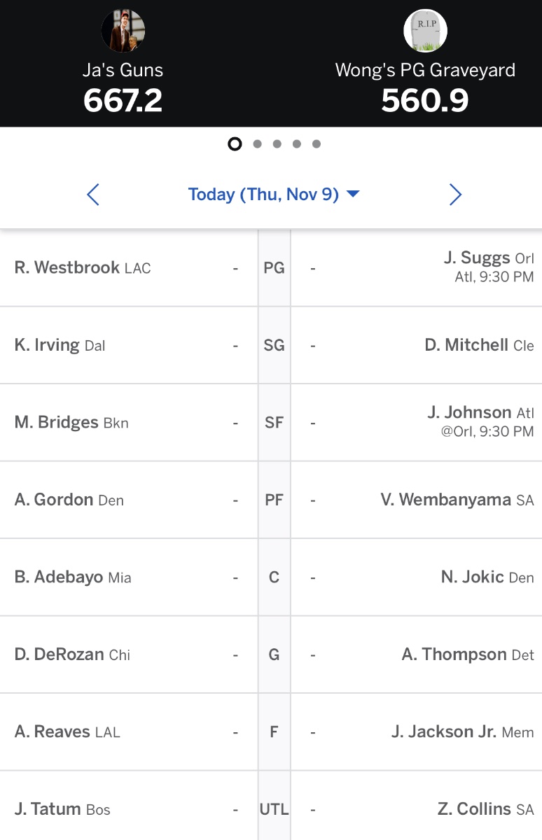 November 9, 20232 yr 1 hour ago, paco said: @Shepard Wong is cheating. Dude is using knowledge. Just imagine having to play against him in fantasy sports.  Although I am winning so far this week…