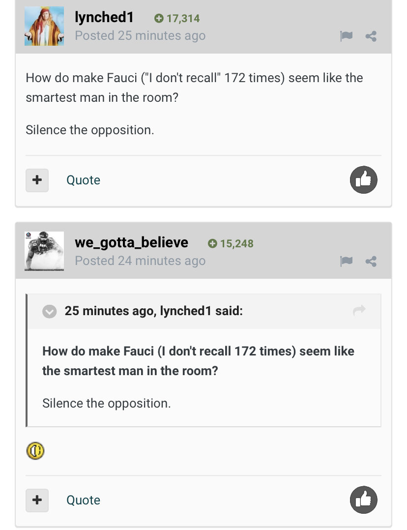 December 9, 20223 yr Just now, lynched1 said: How do make Fauci (I don't recall 172 times) seem like the smartest man in the room? Silence the opposition.