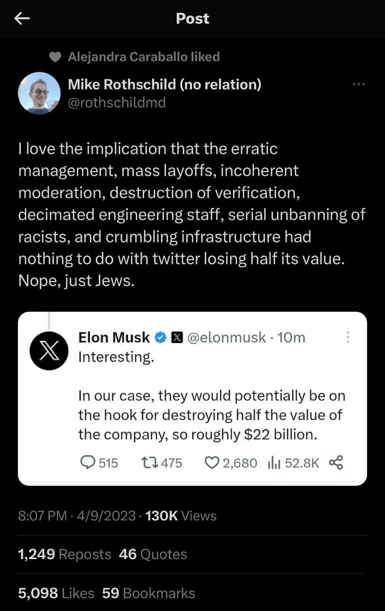 September 5, 20232 yr 31 minutes ago, Dave Moss said: Elon is tweeting that he will sue the Anti-Defamation League Lmao Once his lawyers remind him of discovery, he'll pivot with some excuse.