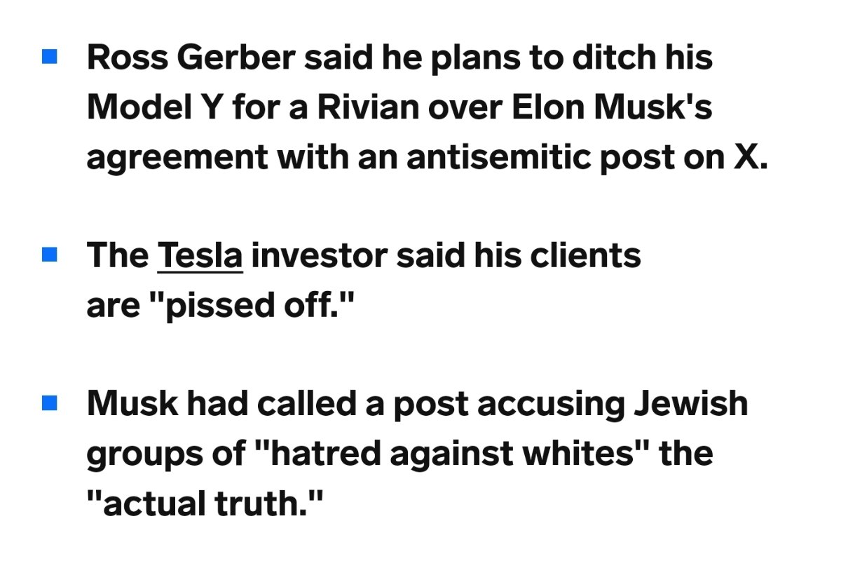November 17, 20232 yr Well if it isn't the consequences of my own actions. As if anyone needed any more info into what a POS Elon is. IBM Immediately Suspends Advertising From X/Twitter After Discovering Its Ads Appeared Next to Pro-NSDAP Content A top Tesla investor said he plans to ditch his Model Y for a Rivian after Elon Musk agreed with antisemitic post Meanwhile, Musk in May 2023 wrote on Twitter, "Soros reminds me of Magneto,” comparing billionaire financier and philanthropist George Soros to the Jewish supervillain from Marvel’s X-Men series. Musk said Soros, like Magneto, "wants to erode the very fabric of civilization. Soros hates humanity.” Musk’s comparison of Soros to Magneto drew a rebuke from Anti-Defamation League CEO Jonathan Greenblatt, who noted, "Soros often is held up by the far-right, using antisemitic tropes, as the source of the world’s problems.”