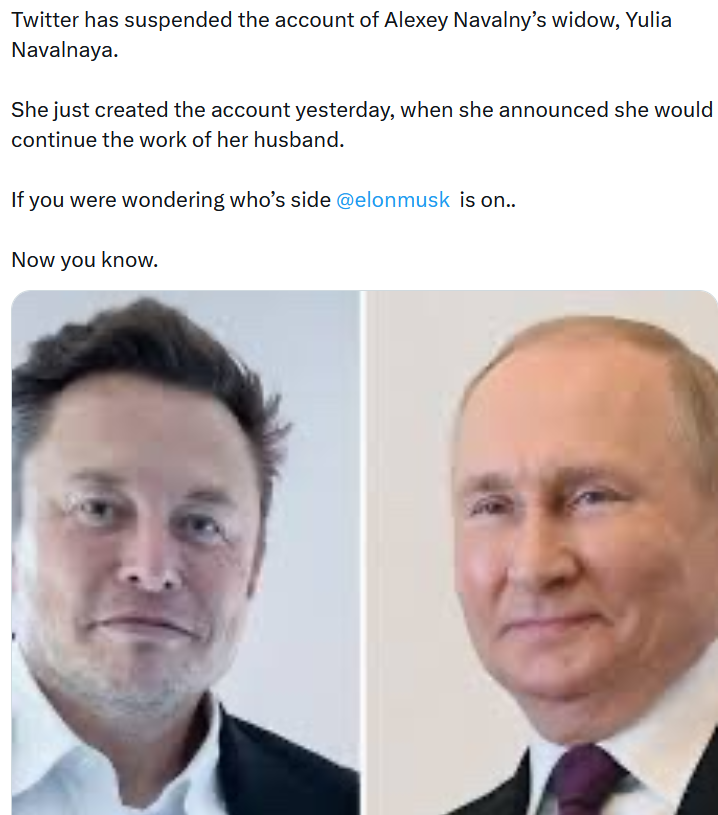 February 20, 20241 yr 10 minutes ago, Toastrel said: This is actually true. WTF https://news.sky.com/story/alexei-navalnys-wife-yulia-navalnaya-has-x-social-media-account-suspended-13076185