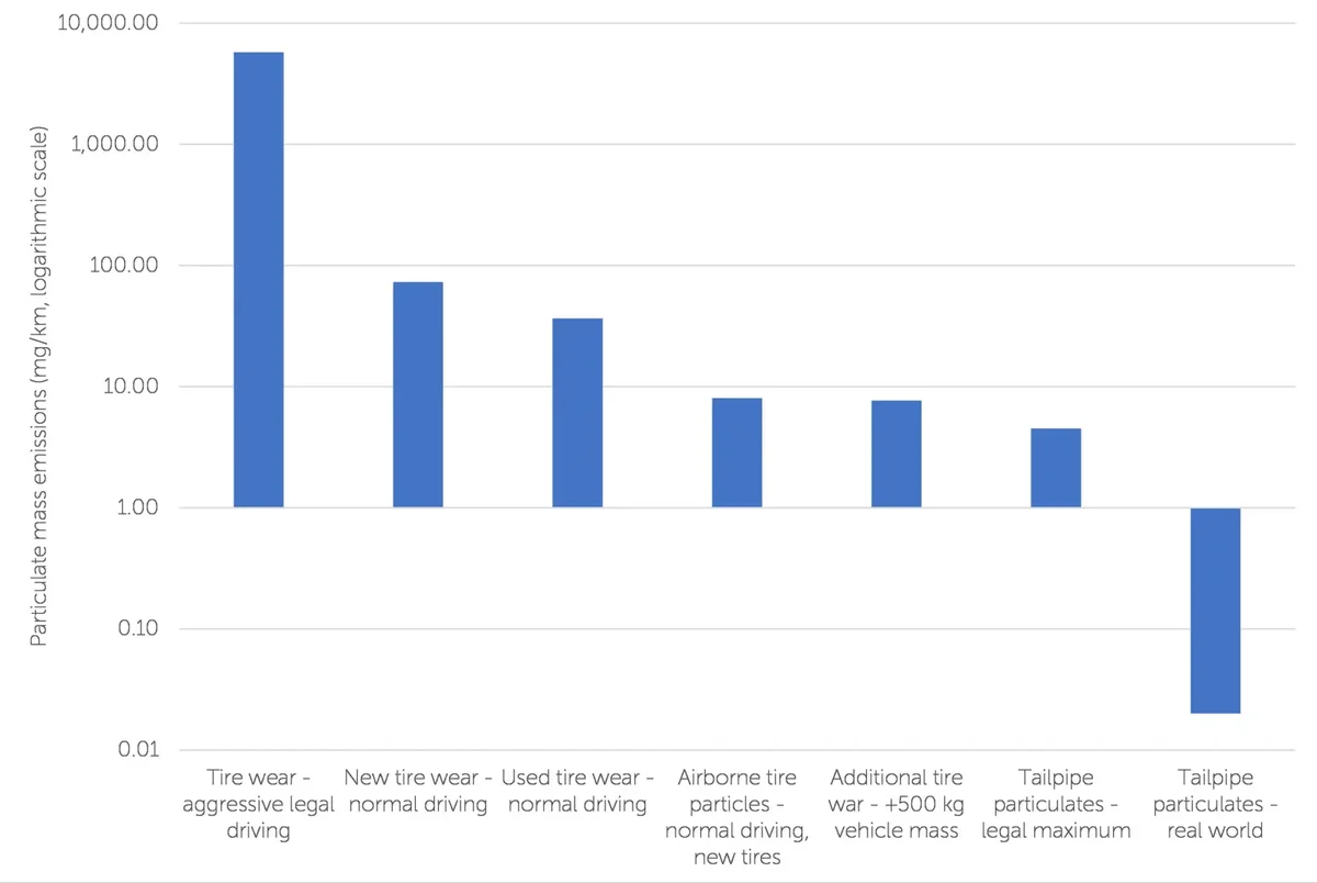March 5, 20241 yr Quote Because EVs are on average 30% heavier, brakes and tires on the battery-powered cars wear out faster than on standard cars. Emission Analytics found that tire wear emissions on half a metric tonne of battery weight in an EV are more than 400 times as great as direct exhaust particulate emissions. For reference, half a metric tonne is equivalent to roughly 1,100 pounds. The most popular EV in the US, Tesla’s Model Y, boasts a lithium-ion battery that weighs in at a hefty 1,836 pounds. Another sought-after electric model, Ford’s F-150 Lightning pickup truck, also has an approximately 1,800-pound battery. Tires are the largest source of air pollution?