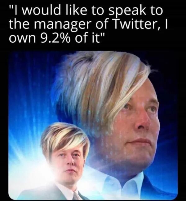 April 12, 20223 yr 6 hours ago, Procus said: https://www.nbcnews.com/business/business-news/elon-musk-backing-twitter-board-opens-door-hostile-takeover-rcna23906 Elon Musk backing off Twitter board opens door to hostile takeover Which in no way refutes what I said, which was the ownership limit was known at the time of the board announcement. As far as what Elon Musk is going to do? Hell, I don't think he knows what he will do most mornings.