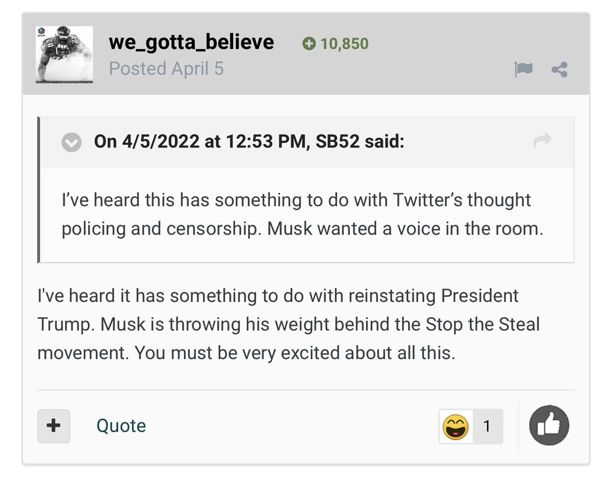 April 14, 20223 yr On 4/12/2022 at 10:58 AM, vikas83 said: Or he's bored and basically trolling to entertain himself. When it comes to Musk, assume anything is possible. But actually going hostile on TWTR when he already has the SEC on his arse...bold. I guess he's bold.