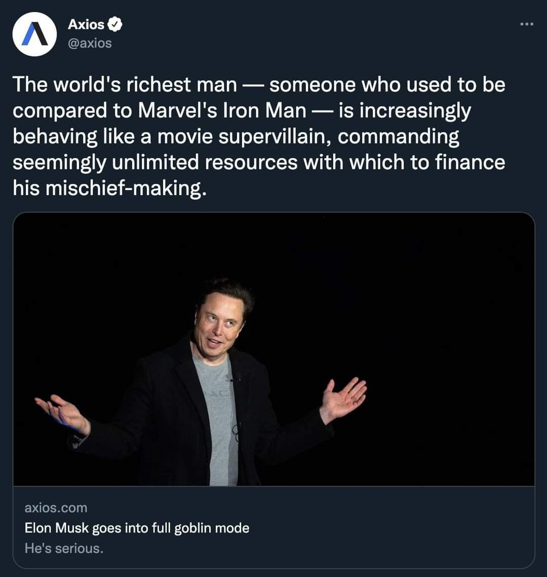 April 14, 20223 yr 34 minutes ago, Aspiritfall said: I'm asking because I have absolutely no clue but why does Musk want to buy Twitter? The guy doesn't seem to give a crap about the left or right. He's a rich nonconformist who smokes pot and doesn't like people being ****.