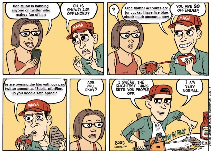 November 7, 20223 yr 2 minutes ago, Kz! said: Articles that literally say that global democracy might not survive Elon Musk acquiring twitter. But yeah, no one is melting down at all. Liberals are OK. Take a breath, dude. Meanwhile... 2 minutes ago, Toastrel said: Dude's actively chasing away his entire customer base on two fronts.