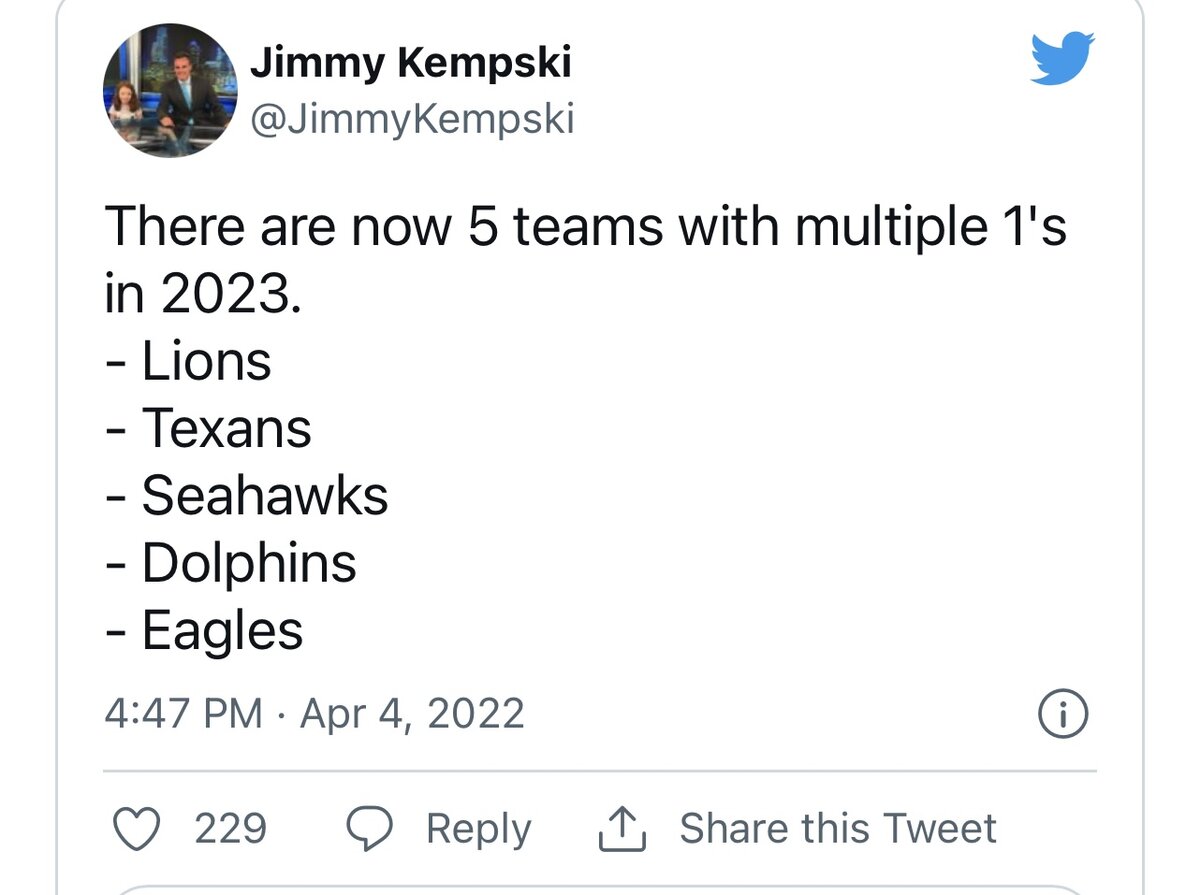 April 4, 20223 yr Author 7 minutes ago, VaBeach_Eagle said: Who do we trade #18 to this year for their first and next year's first, so that we have 2 this year and 3 next year? lions at 32