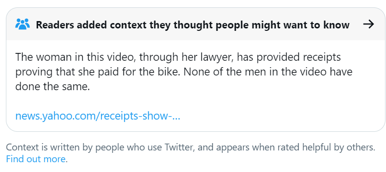 May 19, 20232 yr Author On 5/15/2023 at 3:54 PM, jsdarkstar said: Dude paid for the bike rental and she tries to take it from him with her White Privilege. A viral video appears to show a white woman trying to take a bike from a young Black man, sparking outrage over racism and 'weaponized' tears Get off me you're hurting my fetus. so unsurprisingly there was more to the story than the short viral video showed. The lady paid for the bike. But hey, she and her husband did have to leave the city due to death threats and she is on leave from her job after going viral, so it all worked out.